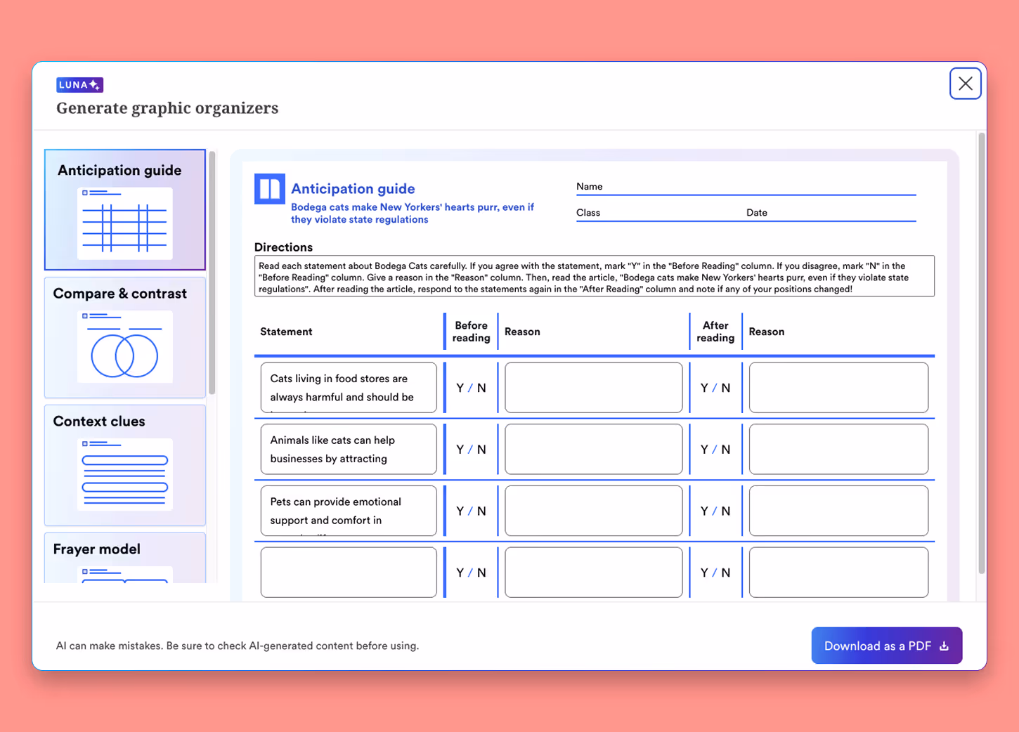 Newsela ELA uses purposeful AI through your AI-powered assistant Luna to support a variety of instructional needs and student supports.